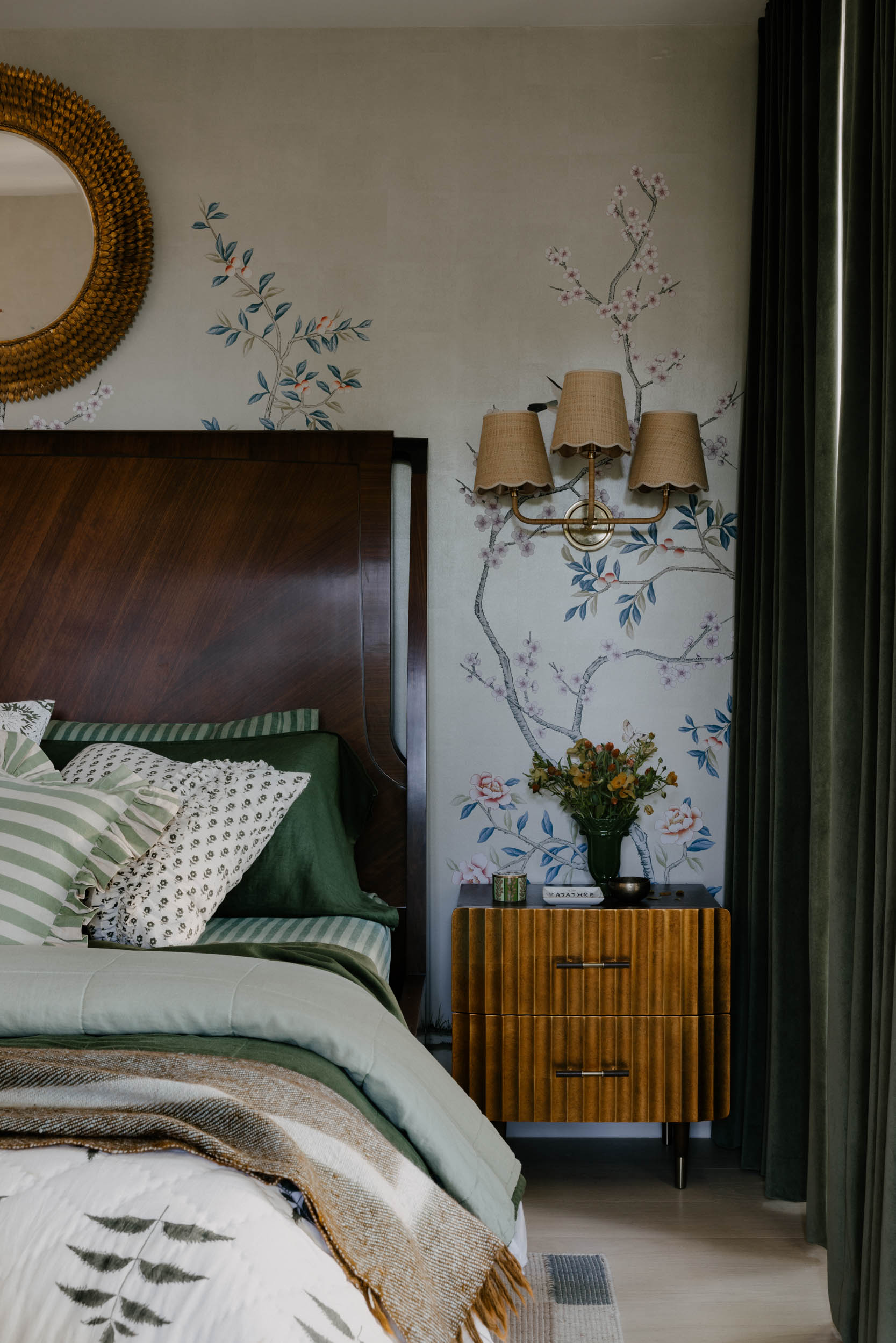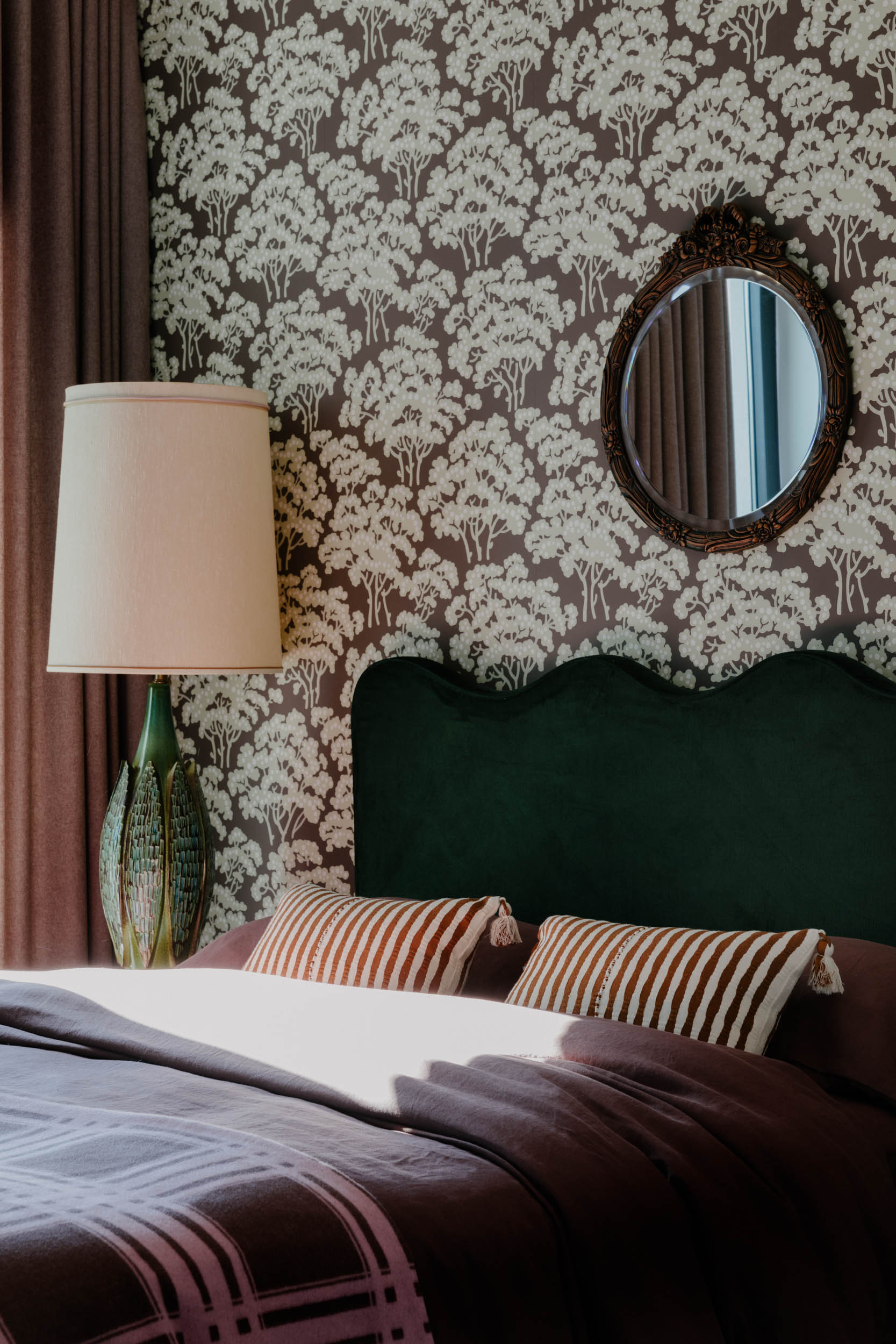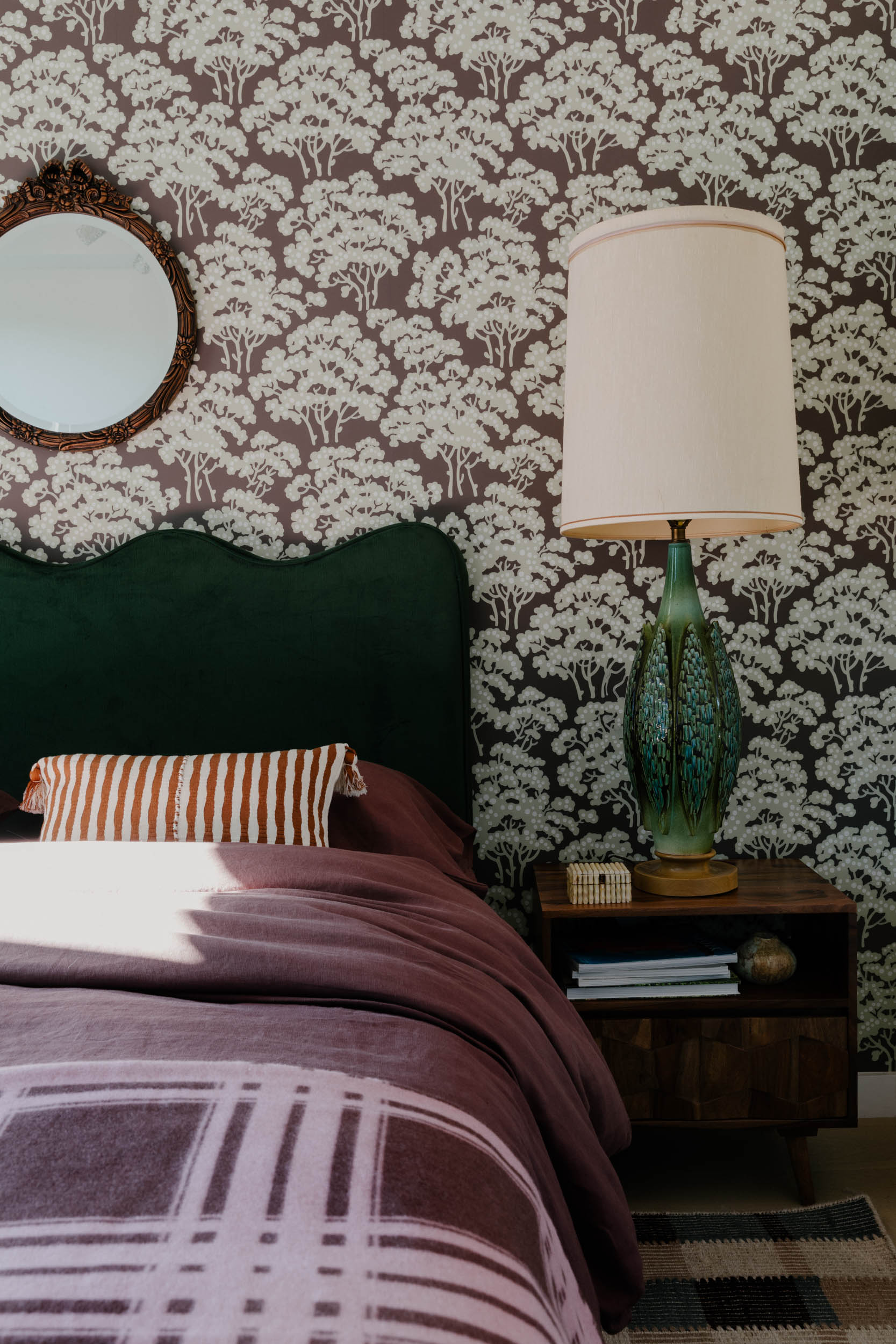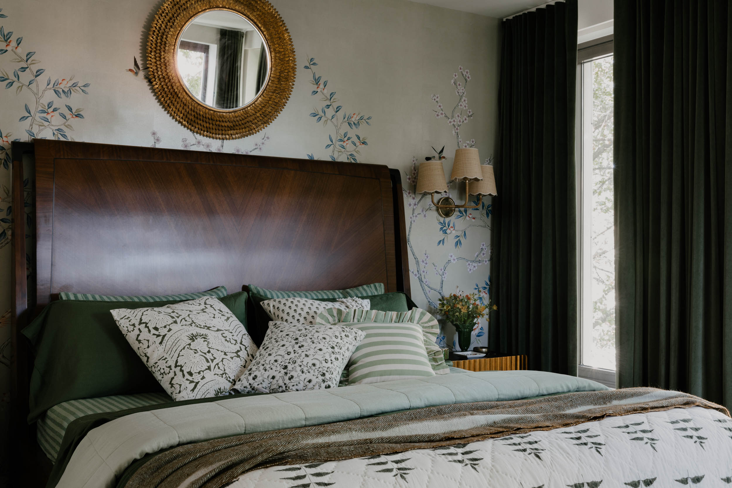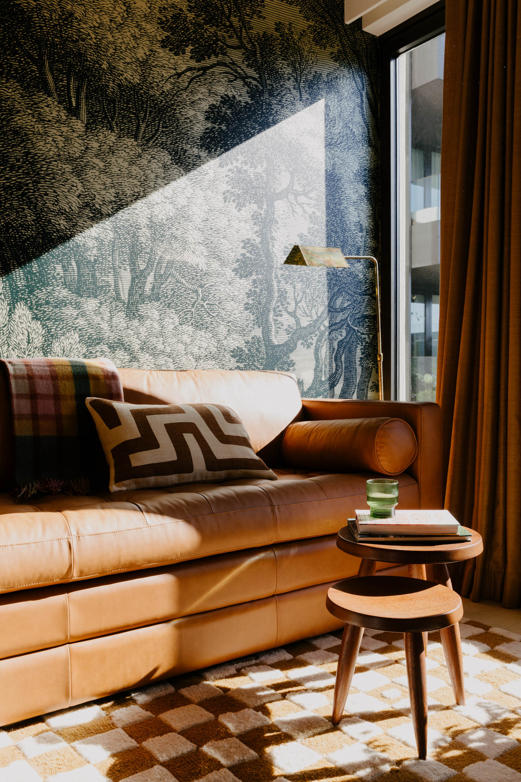 The jewel of this oasis is the custom tree mural in the living room, standing at over 15 feet tall and 30 feet wide, it creates a breathtaking focal point that brings the outdoors in. Each room is adorned with wallpaper that embraces the beauty of the natural world with a touch of whimsy.